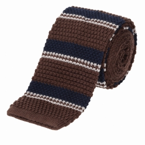 Knit wełniany brązowy w paski - krawat dzianinowy zakończony na równo EM