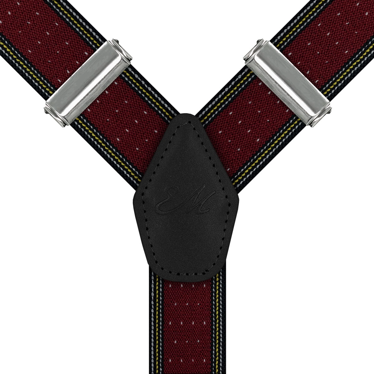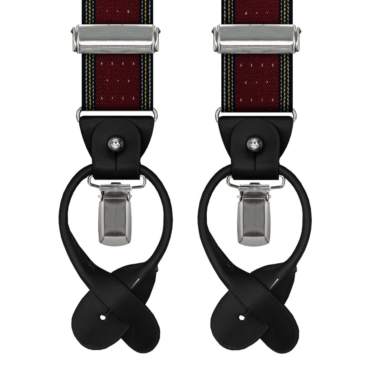 Szelki bordowe w kropki zapinane na guziki z wykończeniem skórzanym w kolorze czarnym EM