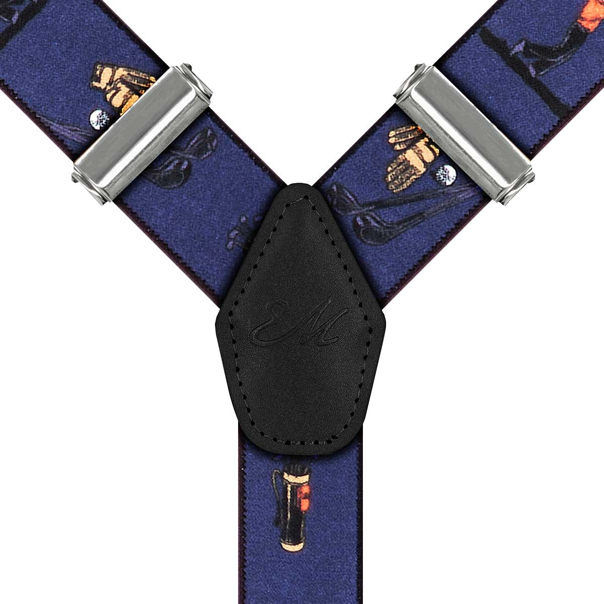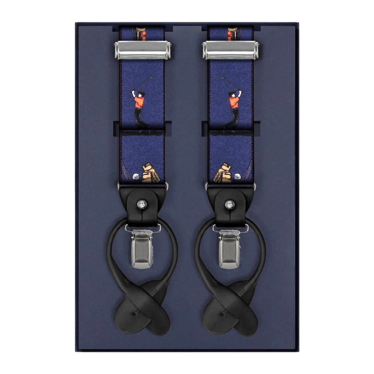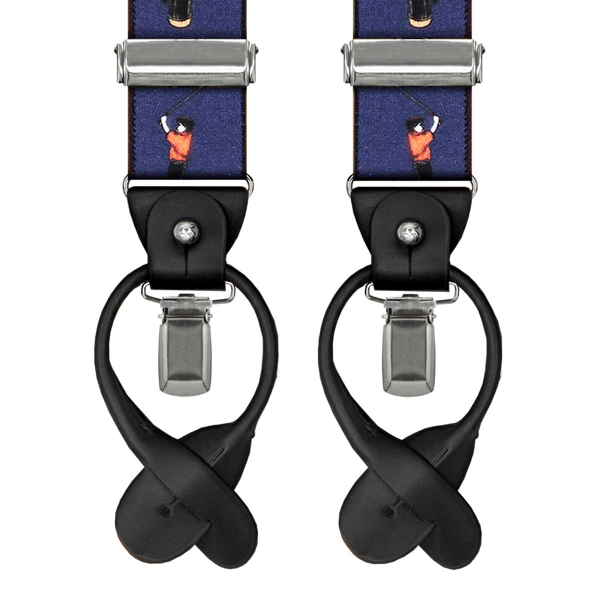 Szelki granatowe w golfistów zapinane na guziki z wykończeniem skórzanym w kolorze czarnym EM